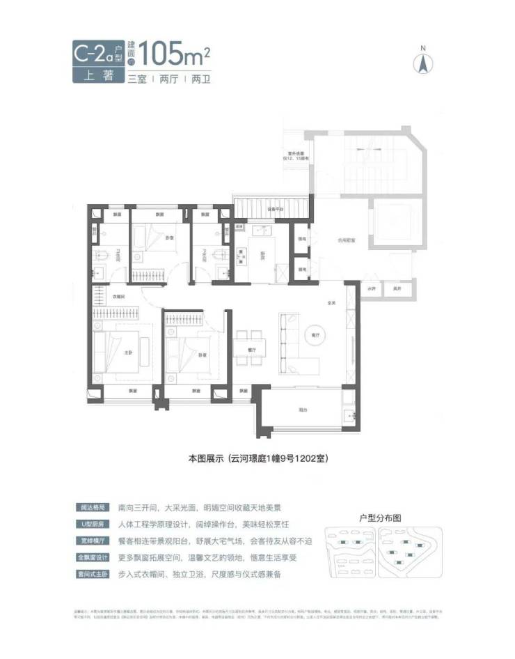 文中所示楼栋幢号均为工程编号,以实践方位为准其次是建面约105㎡3房横厅户型。