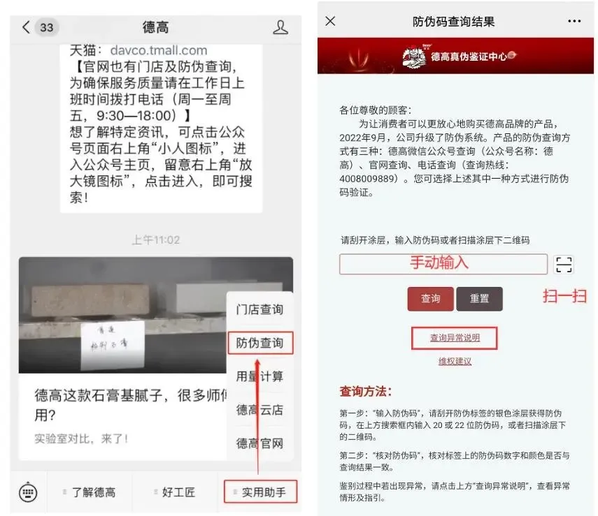 别~不法分子十分奸刁,“做戏做全套”那种,直接微信扫防伪码,分分钟跳转到他们“规划”的假防伪网站。因而,强烈推荐优选德高官方端口进行查询。辨别进程如遇反常,可点击“查询反常阐明”,检查对应反常选项。